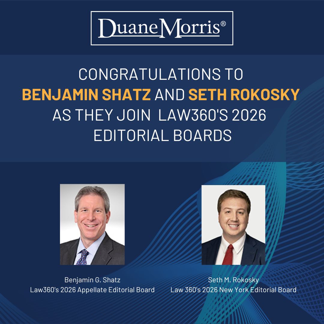 Duane Morris Partners Benjamin Shatz and Seth Rokowsky have been named to Law360 2026 Editorial Advisory Boards. Benjamin was named to the publication’s Appellate Editorial Board. Seth was named to the New York Editorial Board.