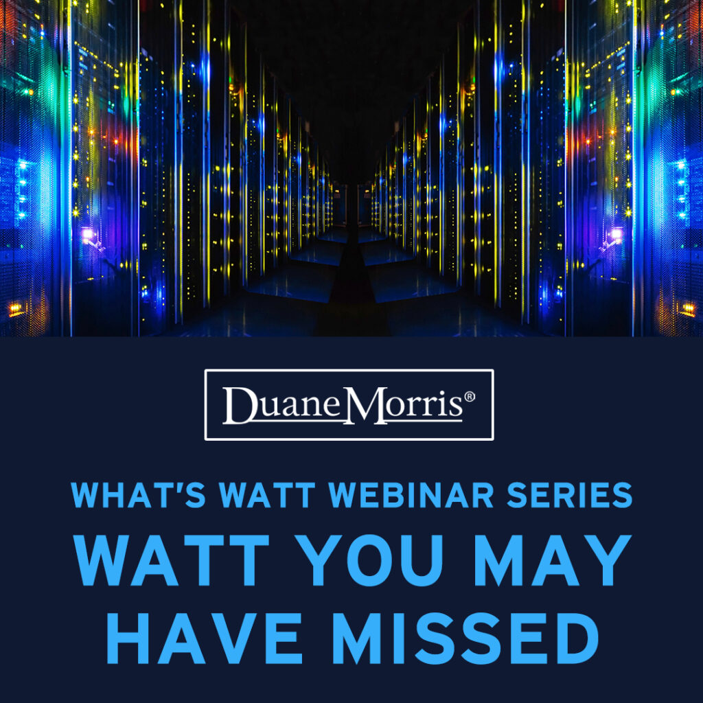 Last week, Duane Morris kicked off a new multipart webinar series—What’s Watt— taking a deep dive into the critical relationship between energy and modern data centers and highlighting the trends and technologies reshaping digital infrastructure. The series launched with a state-of-the-market discussion with DigitalBridge’s Jeff Ginsberg and Duane Morris’ Robert Montejo, moderated by Brad Molotsky. The panel offered insights on the industry’s key trends.