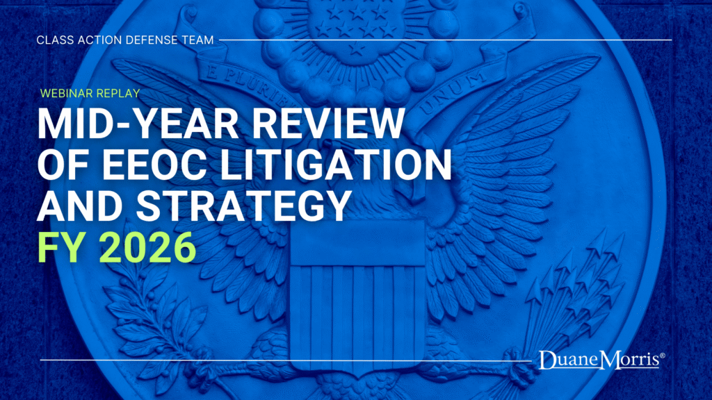 Duane Morris Takeaways: We were honored to have so many loyal blog readers join us for our annual Mid-Year Review of EEOC Litigation And Strategy For Fiscal Year 2026 yesterday. The full video presentation, hosted by Jerry Maatman, Jennifer Riley, and Daniel Spencer, is below: