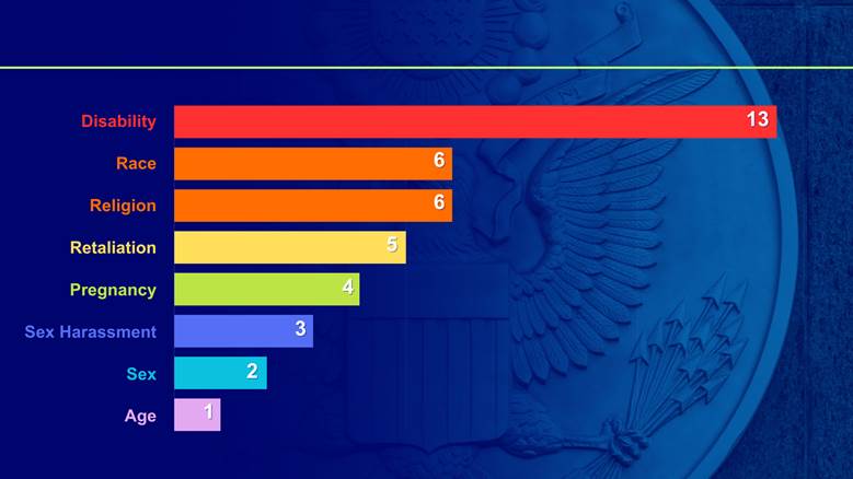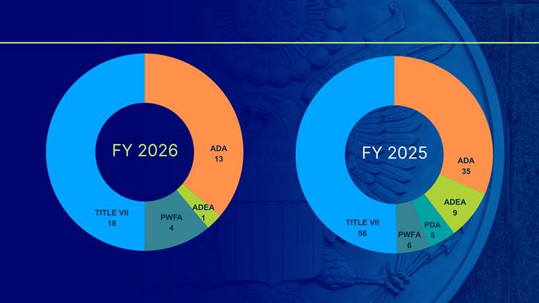 Title VII cases once again made up the majority of cases filed. They constituted 50% of all filings in FY 2026 (same as FY 2025, down from 58% of all filings in FY 2024, and significantly down from 68% of all filings in FY 2023). Overall, ADA cases made up the next most significant percentage of the EEOC’s FY 2026 filings for a total of 40%. This is up from 31% in FY 2025, yet similar to the 42% of filings in FY 2024. So far there has only been one filing under the ADEA in FY 2026, down from the uptick in ADEA filings in FY 2025. The EEOC filed 9 ADEA cases in FY 2025, compared to 6 age discrimination cases in FY 2024, 12 age discrimination cases in FY 2023, and 7 age discrimination cases in FY 2022. In the first six months of FY 2026, the EEOC filed 4 cases under the Pregnant Worker’s Fairness Act, on track compared to 6 filings in FY 2025 and 3 filings in FY 2024. So far, no cases filed under the Pregnancy Discrimination Act. Notably absent from FY 2026’s filings are cases brought under the Equal Pay Act and Genetic Information Nondiscrimination Act – two areas that the EEOC repeatedly has cited among its enforcement priorities prior to the second Trump Administration.