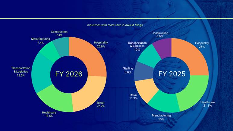 The industries impacted by EEOC-initiated litigation have also remained consistent in FY 2026. The chart below details that hospitality, healthcare, and retail employers have maintained their lead as corporate defendants in the last 18 months of EEOC-initiated litigation. In the first six months of FY 2026, two industries remained in the EEOC’s targets: Hospitality and Retail. On a percentage basis, Hospitality (Restaurants / Hotels / Entertainment) comprised 25.9% of filings, and Retail had 22.2% of filings. A key difference in FY 2025 compared to FY 2024 is Retail (22.2% of FY 2026 filings) overtaking Healthcare (18.5% of FY 2026 filings) and Manufacturing (7.4% of FY 2026 filings) as the next most targeted industry. Transportation & Logistics entered double digit enforcement activity, at 18.5% of the filings. The remaining industry with at least 2 filings is Construction, representing 7.4% of the filings.