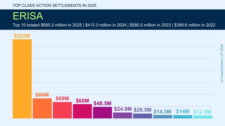 Jerry: Well, it’s certainly true that treatment of 401(k) forfeitures and the rise of ESG investing are reshaping the ERISA landscape. I see it every morning when we check the docket of the new class actions filed around the country. This is certainly a burgeoning area under ERISA. High certification numbers typically beget settlements. How did the plaintiffs’ bar do in terms of taking down major ERISA settlements in 2025?