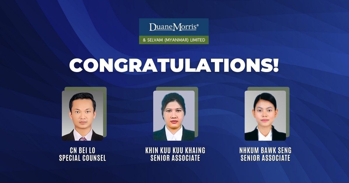 SINGAPORE, November 5, 2025 – Duane Morris & Selvam (Myanmar) is pleased to announce the promotion of CN Bei Lo, Khin Kuu Kuu Khaing, and Nhkum Bawk Seng, effective 1 October 2025. These advancements reflect the firm’s ongoing commitment to nurturing talent and strengthening its leadership in the region.