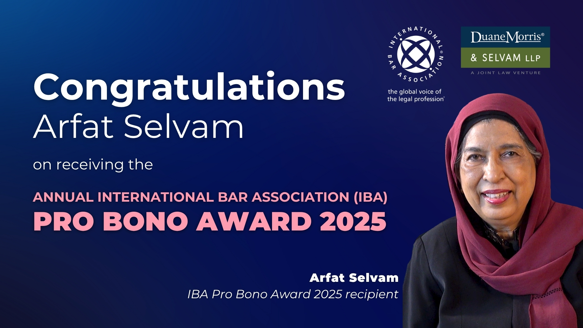 SINGAPORE, 7 November 2025 — Duane Morris & Selvam LLP is proud to announce that our Managing Director, Mrs. Arfat Selvam, has been awarded with the prestigious Annual International Bar Association (IBA) Pro Bono Award 2025 by the Pro Bono Committee at the Annual Conference of the IBA in Toronto, Canada held on 2-7th November 2025.