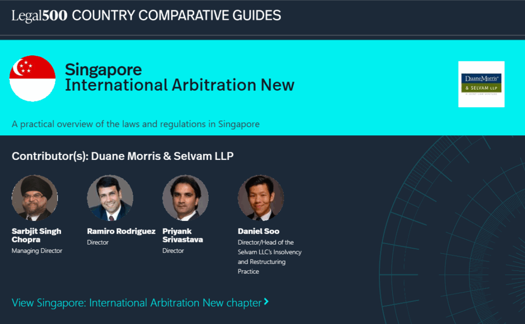 The 10th Edition of The Legal 500: International Arbitration Comparative Guide was launched recently. Duane Morris & Selvam’s Managing Director Sarbjit Singh Chopra and Directors Ramiro Rodriguez, Priyank Srivastava and Daniel Soo have contributed their expert insights to the Singapore chapter.